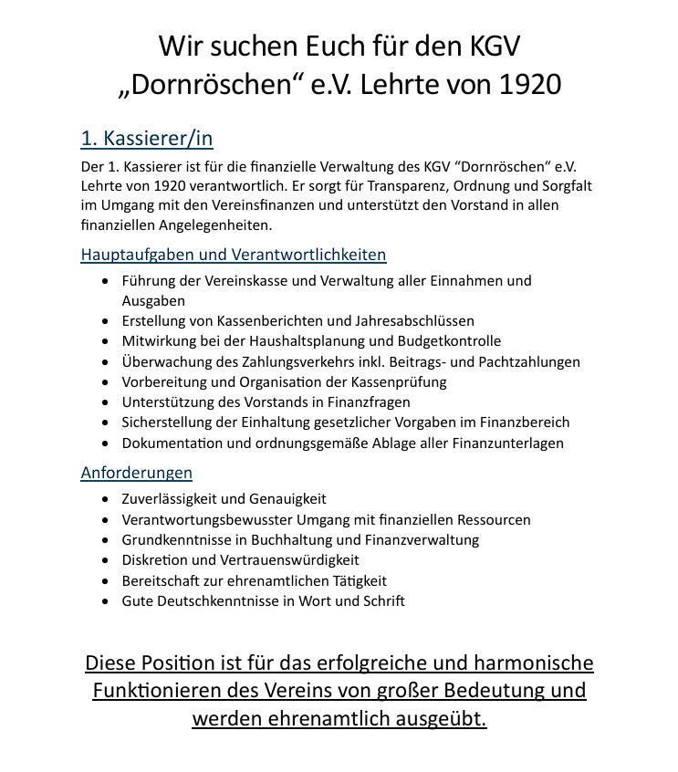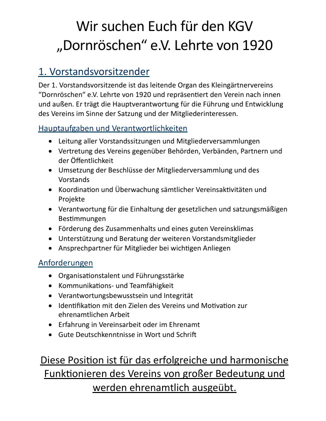 Unser Kleingärtnerverein „Dornröschen“ e.V. Lehrte von 1920 lebt von Menschen, die Verantwortung übernehmen, Gemeinschaft gestalten und unseren Verein sicher in die Zukunft führen.
